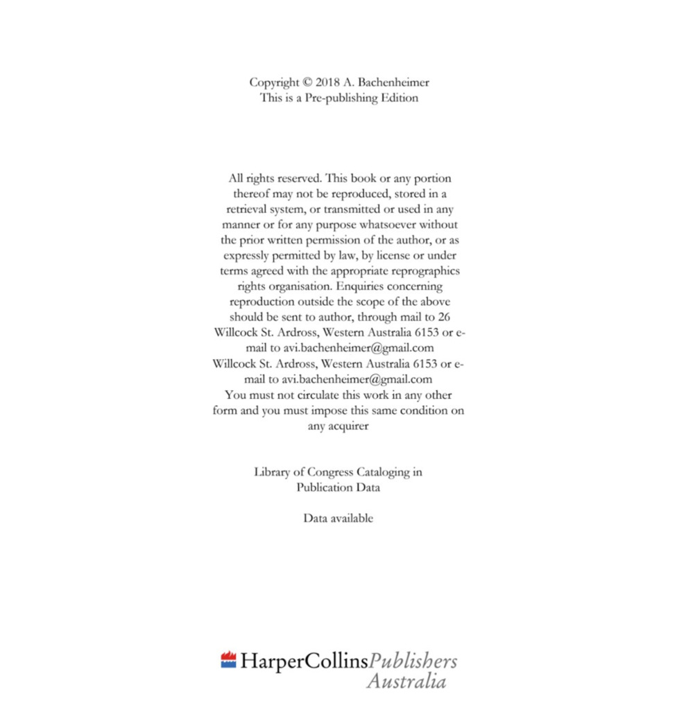 To return to Mr. Bachenheimer’s dictionary, it is clearly not published by Wiley and is therefore a forgery. Someone has evidently doctored a copyright page for it and chosen fonts in keeping with Wiley’s in-house style. I have no idea whether Mr. Bachenheimer himself or a third party is responsible for this forgery. Indeed, one of the dangers of self-publication is that even if a work is copyrighted without a corporate legal team it can be very difficult to protect that copyright. However, this dictionary is not the only one of Mr. Bachenheimer’s publications that purports to be a published work. Google Books also has his A Critique from the Left – Book Review: Shashi Tharoor, Inglorious Empire, What the British Did to India. Despite obviously being a book review (albeit of extraordinary length), the copyright page, which indicates that it is a pre-publication text, includes a HarperCollins Australia logo.