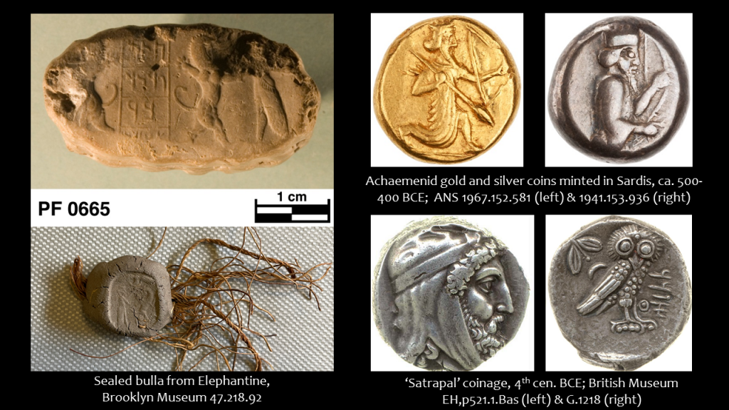 Having just returned from the Dura-Europos conference in New Haven, I am now preparing for my next one, in Toronto on Saturday, where I and the other participants will be present in spirit but not in body. It is the Third Annual Debates in Archaeology Symposium, hosted by the Archaeology Centre, on The Archaeology of Captivating Technology: Making, Wonder, and Power in Material Perspective. My talk is entitled “Imperial Captivation: Seals, Coins and Power in the Achaemenid Empire.” As preview, I give you one of my more visually compelling slides: