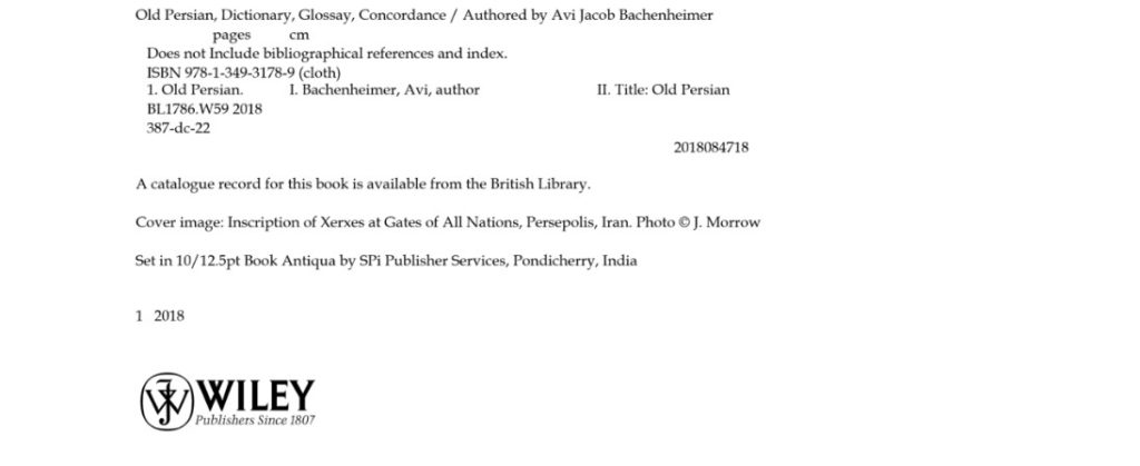 Recently I discovered a new Old Persian forgery. I do not mean a forged Old Persian inscription, although these certainly do exist, and one can consult Rüdiger Schmitt’s indispensable book Pseudo-Altpersische Inschriften (Österreichischen Akademie der Wissenschaften, 2007) on this subject. My discovery is a forgery of rather a different kind. I was on the Wikipedia page for Cyrus the Great the other day (I was trying to figure out how Cyrus’ name is pronounced in modern Persian), where I saw the following citation: Bachenheimer, Avi (2018). Old Persian: Dictionary, Glossary and Concordance. Wiley and Sons. pp. 1–799. The link on the site took me to Google Books, where I found the expected limited preview.