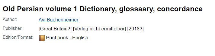 At first I was very pleased as this discovery, since an English language Old Persian dictionary would be most welcome. There is, of course, already an invaluable German dictionary by Prof. Schmitt, Wörterbuch der altpersischen Königsinschriften (Reichert Verlag, 2014), but the advantage of a dictionary published by Wiley is easy online access. Accordingly, I set out to find this new dictionary. I started with the Michigan and NYU library catalogs, but, curiously, I came up empty. I then checked the Wiley website and found nothing. On Worldcat, I found the following: